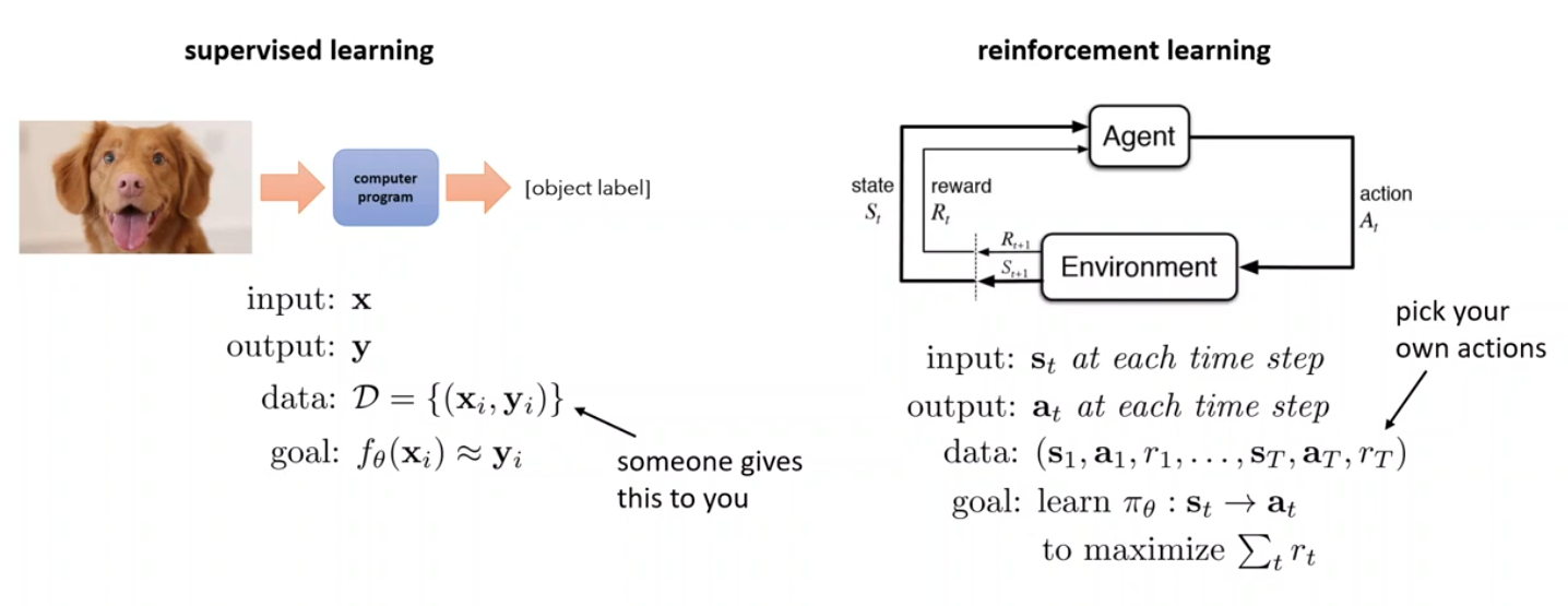 Supervised Learning: (x, y) → learn f: x → y Unsupervised Learning: (x) → learn structure of x Reinforcement Learning: (s, a, r, s’) → learn π: s → a that maximizes Σr