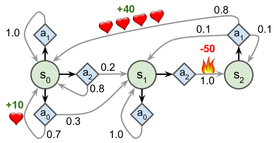 above Markov Decision Process has three states (represented by circles) and up to three possible discrete actions at each step (represented by diamonds). the numerical values are probabilities.